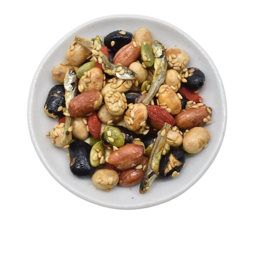 佃煮の職人さんが喜界島産の粗糖とグルテンフリー醤油だけで丁寧に煎った北海道産の白大豆や黒大豆、国産いりこの他に、落花生やかぼちゃの種、胡麻、クコの実を佃煮風に炊き上げました。栄養バランスを考え、豆や小魚を色々な具材と合わせた、老若男女、誰でも食べられる栄養豊富なおやつです。 お子様のおやつや、お茶うけなどに止まらない美味しさです!
